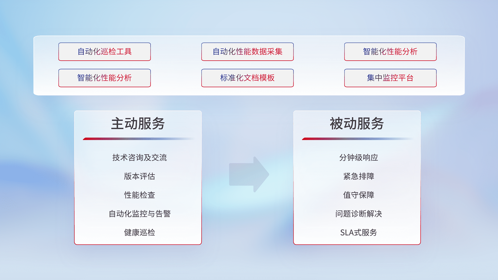 智能化工具和标准化文档,,保障服务质量,,,,提供主动服务(包含技术咨询、、版本评估、、性能检查、、自动化监控与告警、、、健康巡检)和被动服务包含(分钟级响应、、、紧急排障、、值守保障、、、问题诊断解决、、、SLA服务)。。。